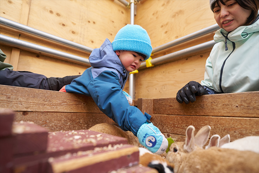 「冬のどうぶつ広場」では、ポニー、ウサギ、モルモット、シベリアンハスキー、フクロウ、アルパカ、ヤギ、ヒツジ、カピバラなど、さまざまな動物たちとふれあうことができます。雪遊びの合間に動物たちと仲良くなれば、子どもの冬の思い出がさらに豊かになるはず。