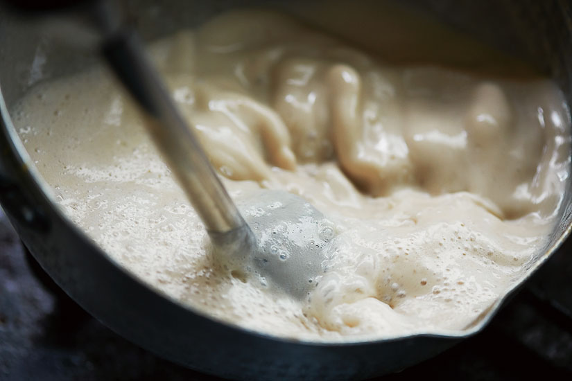 スープは天然コラーゲンたっぷり。エスプーマ状にした生クリームをトッピングしてなめらかでクリーミーな一杯に。
