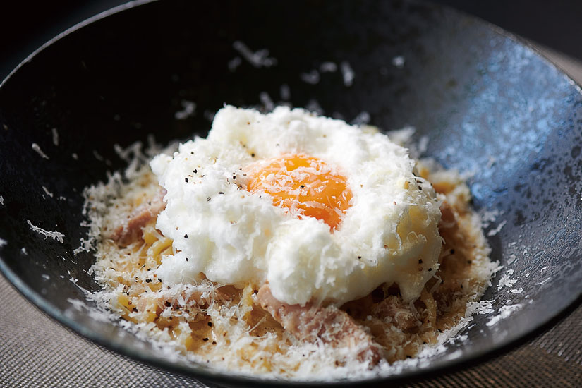 「泡カルボまぜそば」(1,450円)は、卵白を泡立てたふわふわのメレンゲの上に卵黄を落とし、目の前でたっぷりのチーズをかけてくれます。
