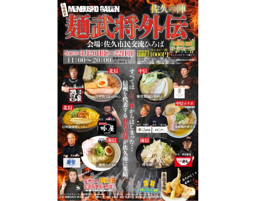「県内各地で行われるラーメンイベント「麺武将」が外伝として佐久市初開催!信州の有名実力店が佐久市に集結します。各店舗の〝はじまりの一杯〟をテーマに原点の一杯を提供します。全6杯こだわりの一杯をお楽しみ下さい。ぜひ3月20日~21日は佐久市民交流ひろばへお出かけ下さい。」と主催者。