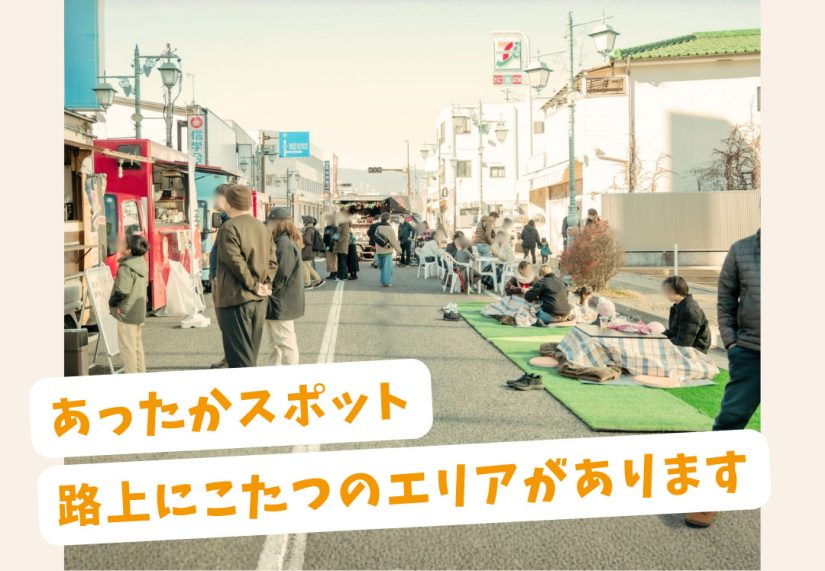 屋外の歩行者天国にもキッチンカーなどが並びます。マルシェには珍しいコタツも設置♪