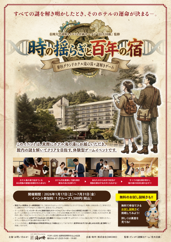 本イベントは、蓼科グランドホテル滝の湯が持つ100年超の歴史をもとに展開する完全オリジナルストーリーです。“時空の揺らぎ”というホテル内の現象を、参加者がひらめきと発見で解き明かす設計です。すべての謎を解いた先に、ホテルの未来をどう導くかが問われます。