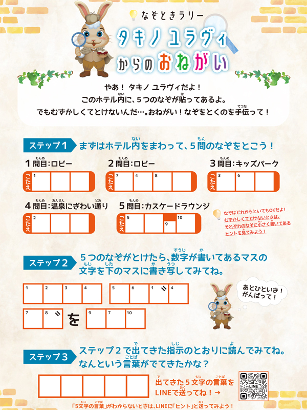 館内の5つのなぞを巡る無料版「なぞときラリー」も実施中です。マスコットキャラクター「タキノユラヴィ」からの依頼に応じて、5問を順に解き、指示通りに読んでキーワードを導きます。