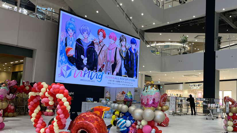 「イオンモール須坂」1F、吹き抜けになっている「Goolightコート」。巨大モニターには「いれいす」が登場しています。