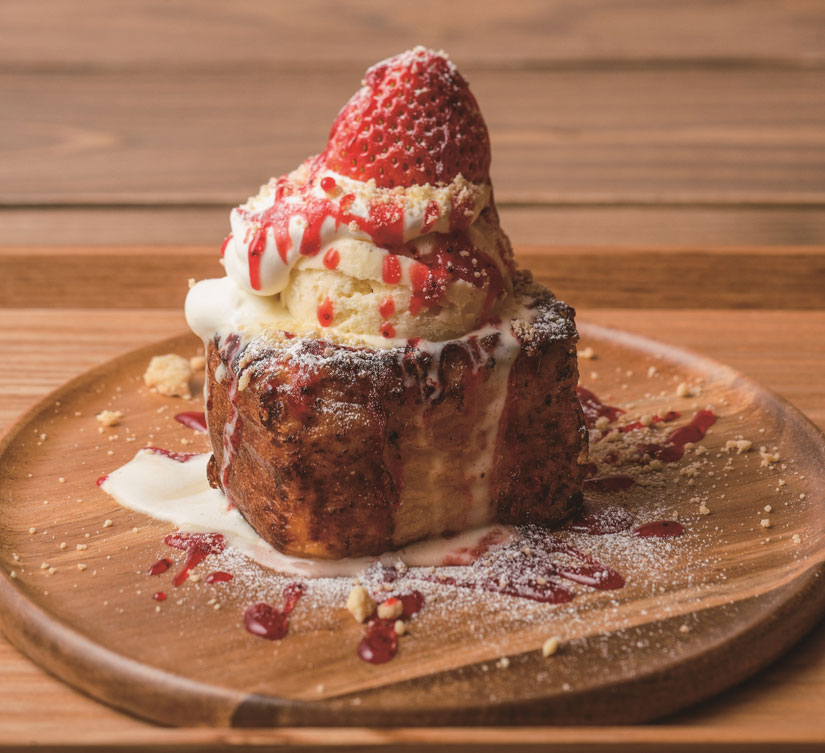 長野県上田市・材木町に2025年2月にリニューアルオープンしたフレンチトーストカフェ「ふわり、ふわる。」。同店の冬季限定メニュー「ショートケーキのような苺のフレンチトースト」は、とろんと溶けたバニラアイスに生クリーム、みずみずしい苺と艶めく真っ赤なソースをまとう姿が魅力。上田市「Liten Bakery」に特注したキューブ型食パンに、卵を2個使った濃厚な卵液を、半日以上じっくり染み込ませるのがおいしさの秘密。鉄板で6面すべてに焼色をつけることで、表面はカリッと香ばしく、中はもっちりふわふわに。温かいフレンチトーストから広がる卵の豊かな風味と、ひんやりクリーミーなバニラアイス、苺のさわやかな甘みが重なり合い、ひと口ごとに幸せな気持ちに包まれます。