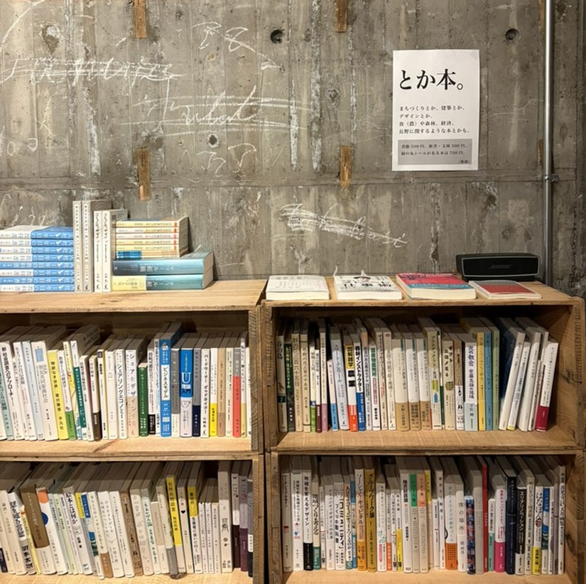 本棚では「とか本。」と題して古本を販売中。ジャンルはまちづくりの専門書から、建築、デザイン、食、経済、信州に関する本などさまざま。価格は書籍550円、新書・文庫は330円、緑のシールが貼ってある本は770円。
