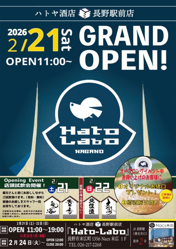 2026年2月21日(土)、長野駅前に新たな酒スポット「Hato-Labo」がオープンします。手がけるのは、1952年創業、70年以上にわたり地域に根ざしてきた老舗「ハトヤ酒店」。本店の想いを受け継ぎながら、より自由に、より気軽に酒と出会える“アンテナショップ”として誕生します。