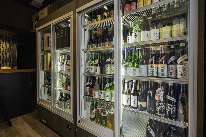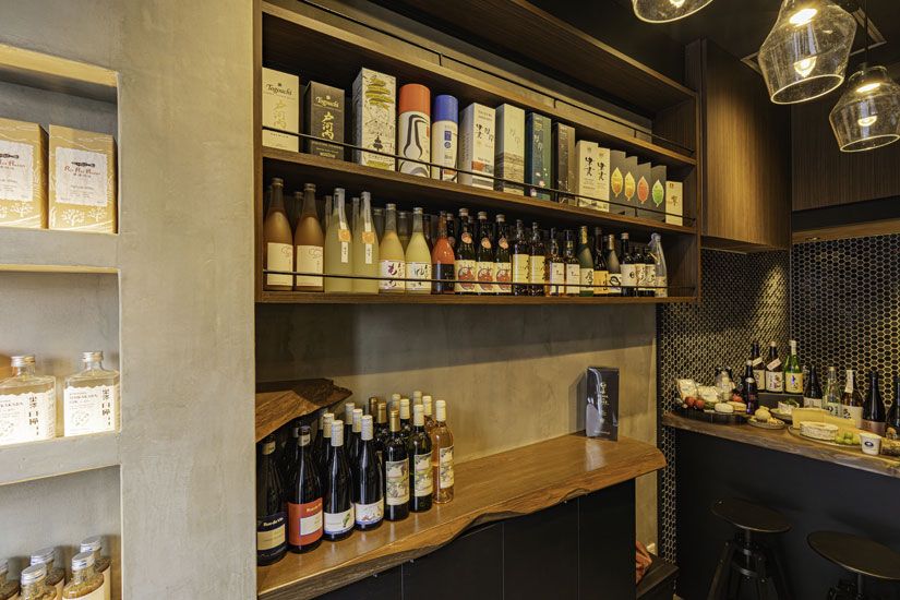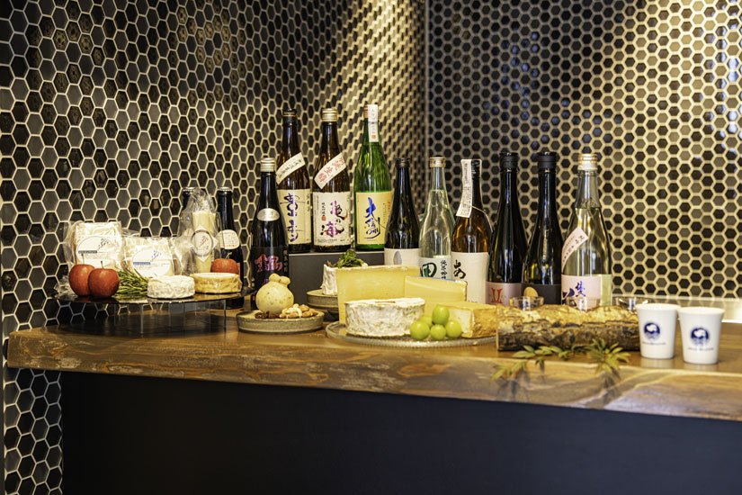 酒のアテには、ボスケソ・チーズラボのチーズも用意。“ラボ”同士のコラボレーションにも注目です。日本酒のほか、ワイン、ウイスキー、ジン、ラムなども充実し、セラーを眺めるだけでも心が躍ります。