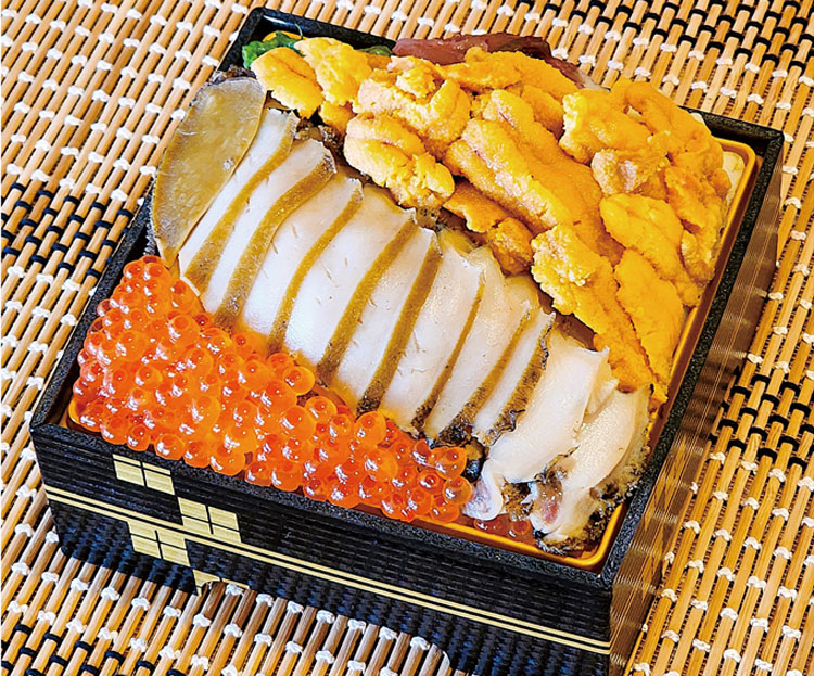三陸産のアワビを丸ごと1個使用。ウニといくらを盛り付けた豪華な1折。