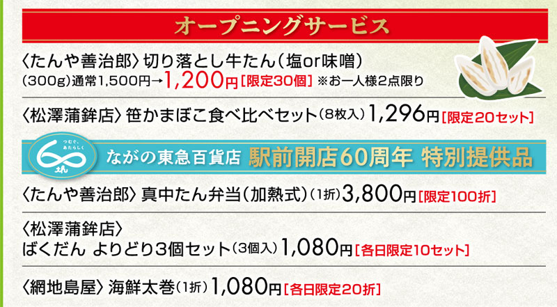 また、仙台銘菓の〈菓匠三全〉「萩の月」は3日間限定で登場。〈たんや善治郎〉の切り落とし牛たん(塩/味噌)300gを1200円で数量限定販売されるなど、オープニングサービスも見逃せませんよ!