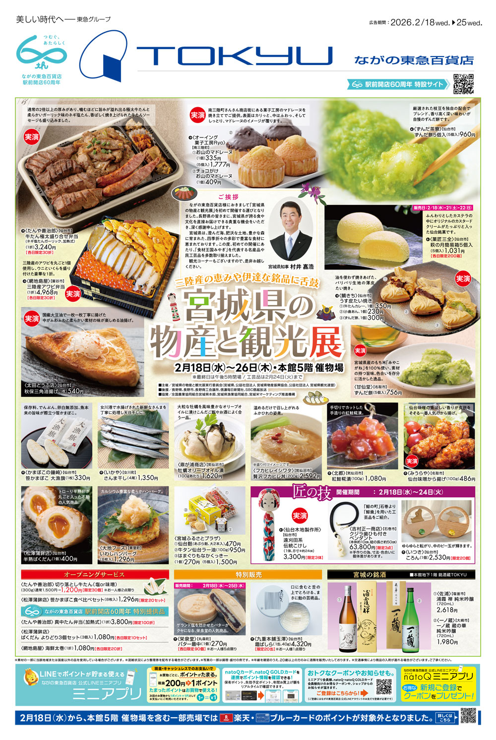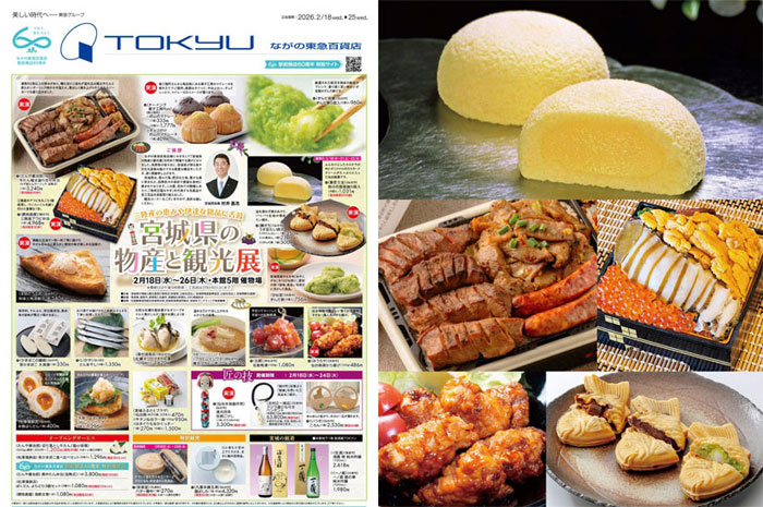 長野県・長野駅前の「ながの東急百貨店」で、宮城県のうまいグルメと工芸品などが集結するイベント『宮城県の物産と観光展 ~三陸産の恵みや伊達な銘品に舌鼓~』が、2026年2月18日(水)~2月26日(木)に開催。