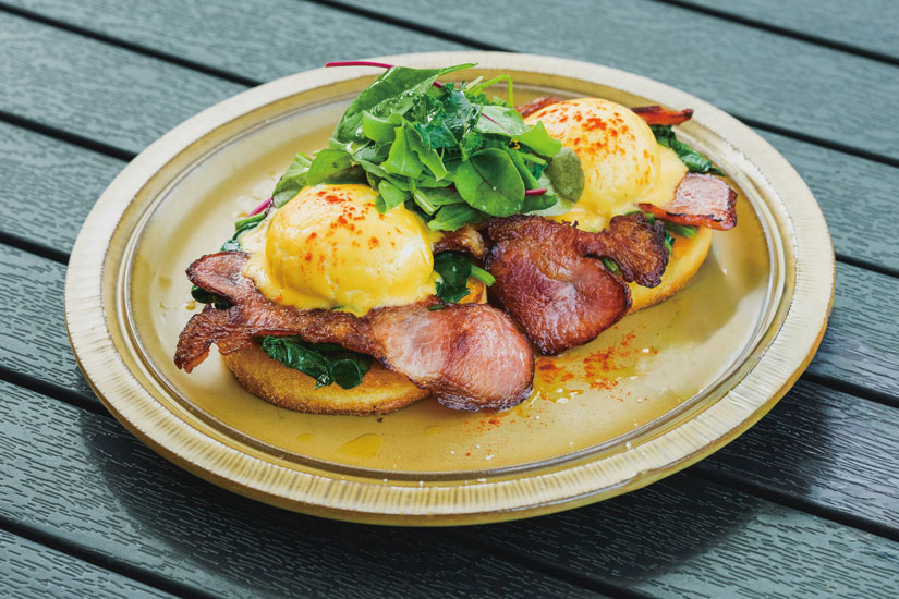 朝食メニューの「エッグズ・ベネディクト」(1,350円)。とろりと黄身がこぼれるポーチドエッグとジューシーなベーコンが朝の空腹を幸せで満たしてくれます。
