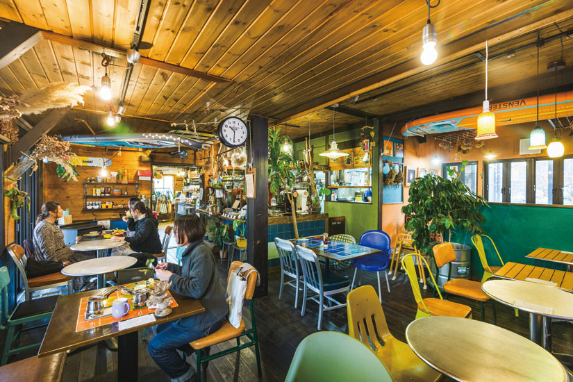 気持ちよく光が指すログハウス調の店内。随所に飾られたイラストやインテリアなどからも異国情緒あふれる雰囲気。