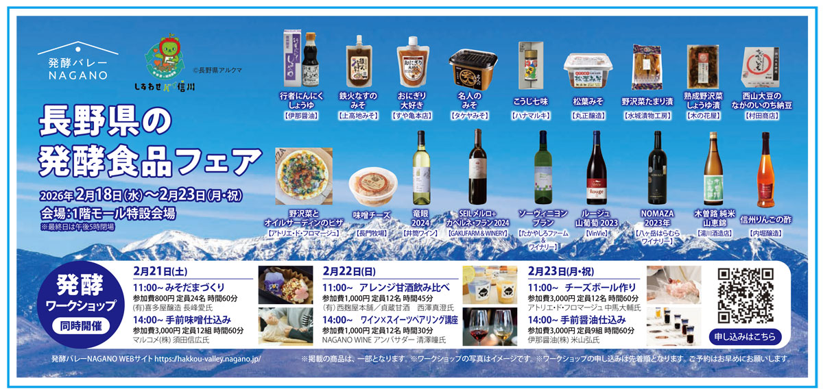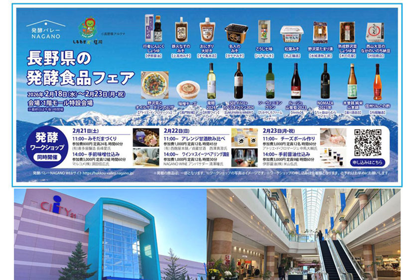 長野県松本市からもアクセス良好の山形村の大型複合商業施設「井上アイシティ21」で、「発酵バレーNAGANO」と「井上百貨店」のイベント『長野県の発酵食品フェア』が、2026年2月18日(水)~2月23日(月・祝)に開催。