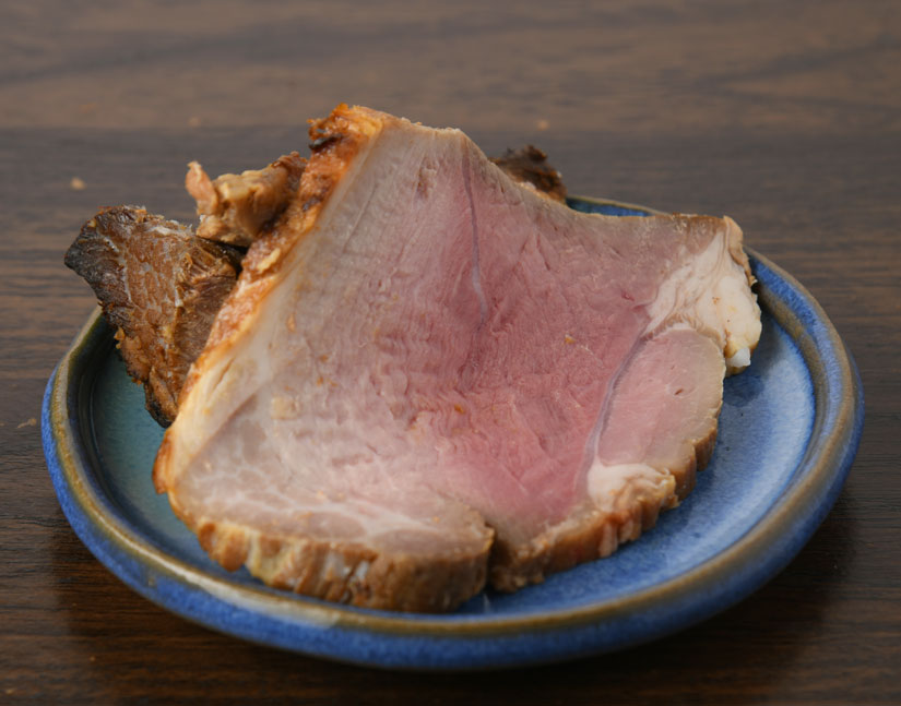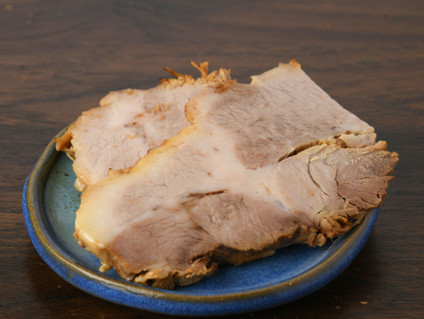「ぶーちゃんレギュラーメン」にも使う炙りチャーシューと、「背オク脂そば」に付く煮込みチャーシュー。