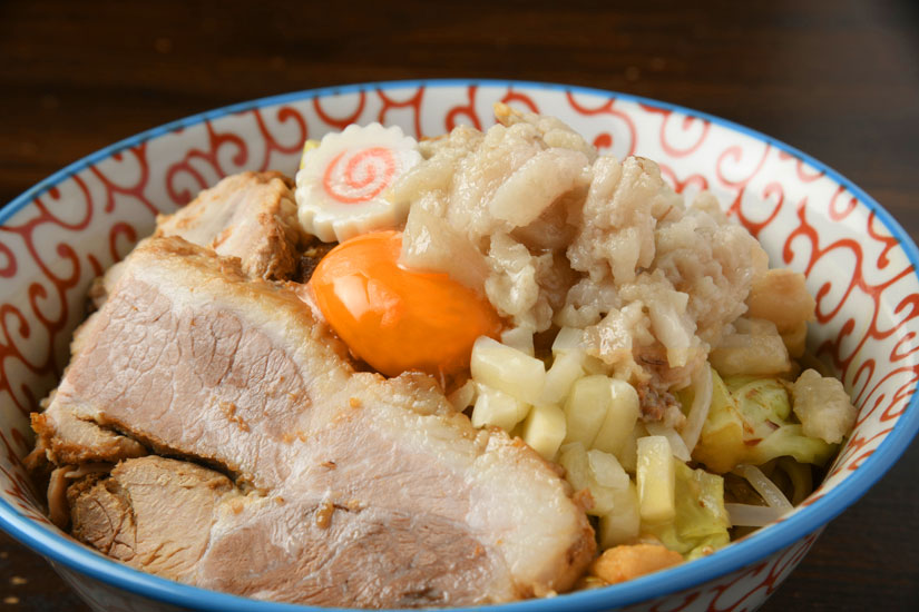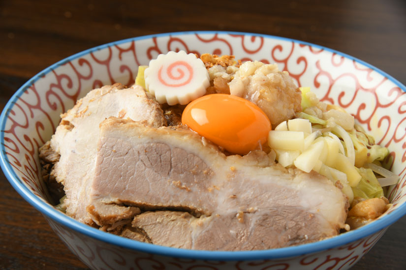 大町市民も待望の二郎系インスパイア。極太のワシワシ麺に、ラーメンと同様に豚の出汁を利かせた濃い目のかえしを使用した汁なしの油そば。麺・背脂・生卵・野菜を混ぜて味わいます。白馬豚のチャーシューは煮豚を使用した厚切りでとろとろ食感。