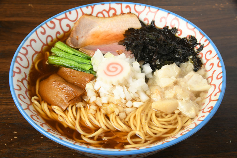 岩手産の煮干しがほんのり香るクリアーな清湯スープ。かえしには、中信地区のラーメン店では有名な松本市の「丸正醸造」の醤油と、甘みとうまみの強い和歌山県の「湯浅醤油」の醤油をあわせ、無化調で仕上げています。豚の出汁も入りコクとうまみ、甘みが加わります。
