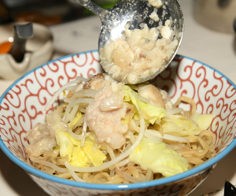 麺も野菜もたっぷり。まさに二郎系の味わいです。背脂はこてこて感がないので多めに入れるのがおすすめ。