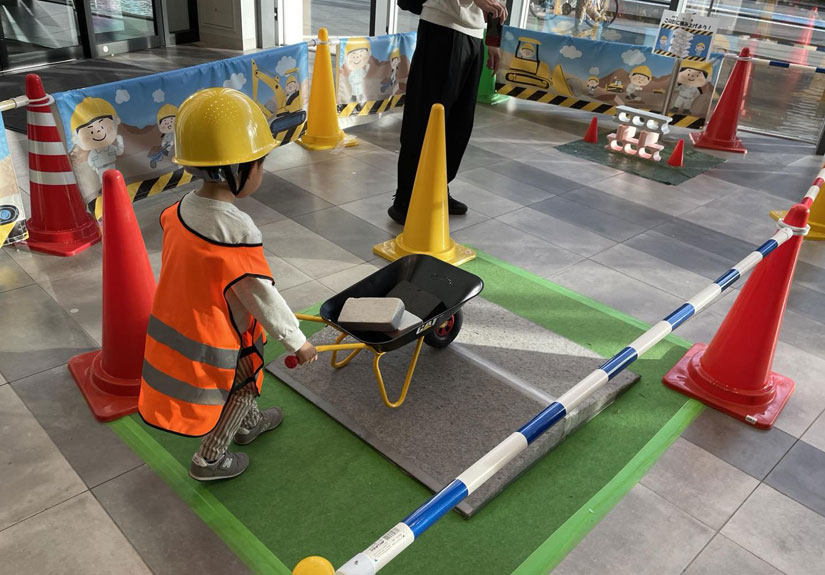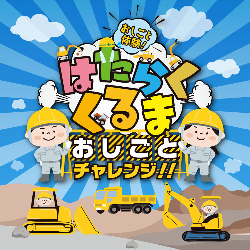 工事現場ではたらくクルマをテーマに、おしごと体験にチャレンジ!3つのおしごとを無事にクリアして、プレゼントをもらっちゃおう。※未就学児のお子さまは保護者と一緒に参加ください