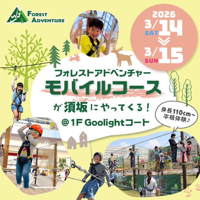 自然の中で体を動かして本気で遊ぶことができる「フォレストアドベンチャー」。長野県内では、長野(長野市)と蓼科(茅野市)あるアウトドアパークが「モバイルコース」を展開。「イオンモール須坂」館内の1階「Goolightコート」に2日間限定で出現します。
