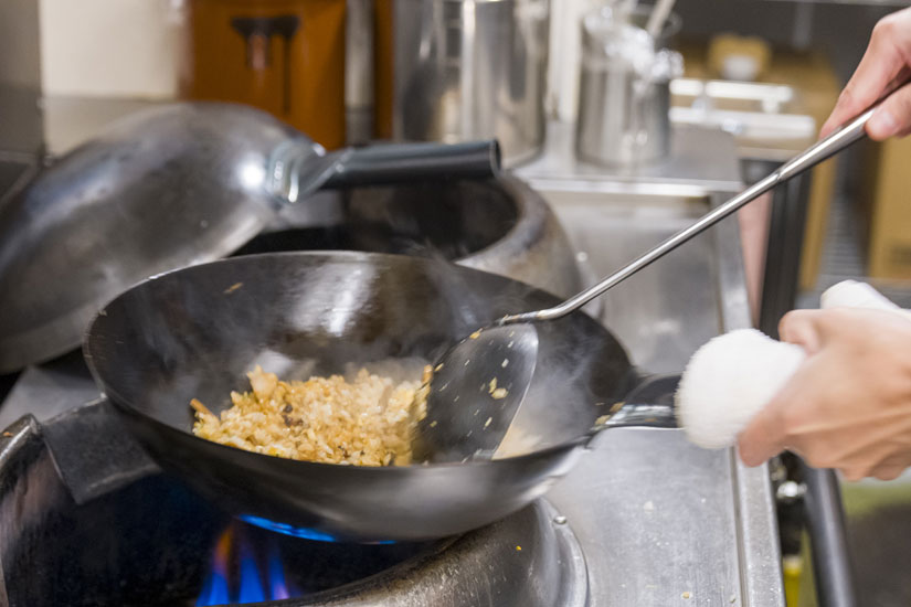 鉄なべに卵を落とし、ごはんと具材がよく絡むように細かくなべをふるいながら仕上げていきます。あまりの手際の良さに驚き、心の中で拍手喝采!