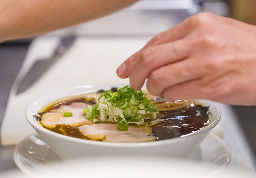 「ラーメンの決め手はかえし。醤油の層に、最後は火を入れない醤油を加え仕上げています。京都風と見せかけて、実は全然京都風じゃない。ぜひ食べて感じてください」