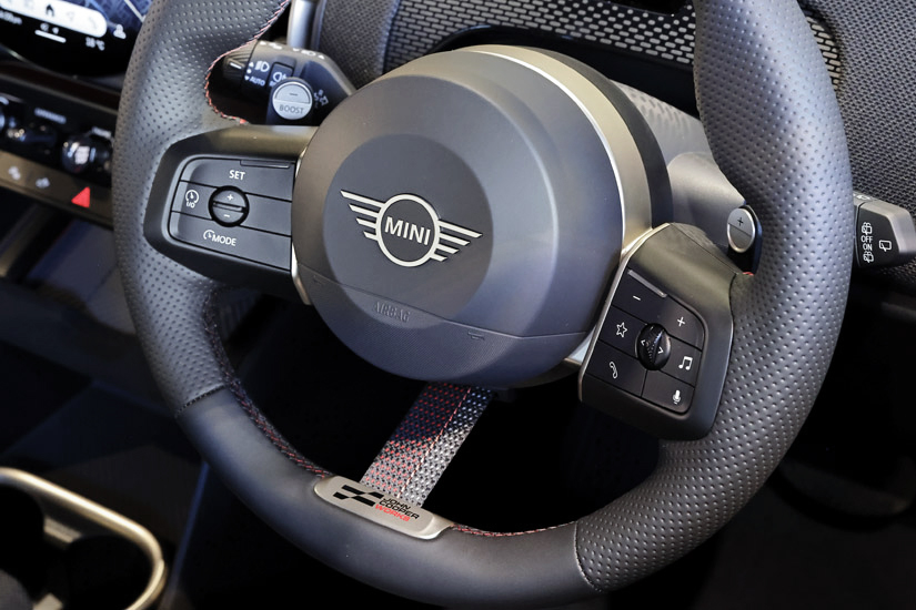 エクステリアでは、ボディにレジェンド・グレー、ルーフにブラックのコンビネーションを採用。バンパー部分や19インチの「JCWランウェイ・スポーク ブラック」のアルミホイールなど、オリジナルなカラーリングと「JCW TRIM」のバランスがシックな印象を見る人に与えます。