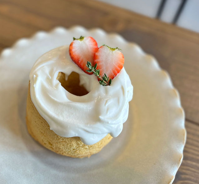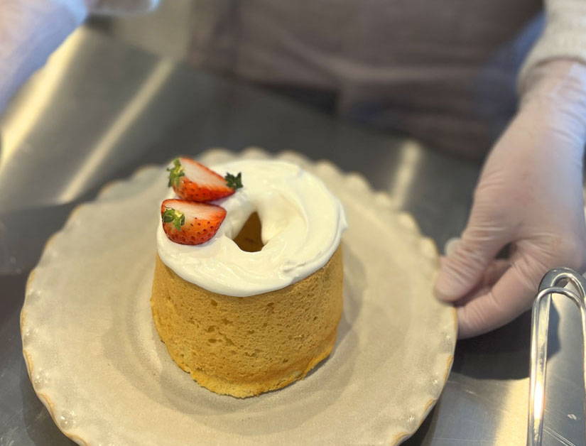 直径11cmの型で焼き上げるシフォンケーキをホールのまま提供。全卵を使って焼き上げるシフォン生地は、ふわっと軽くしっとり食感で、やさしい卵の風味が広がります♪