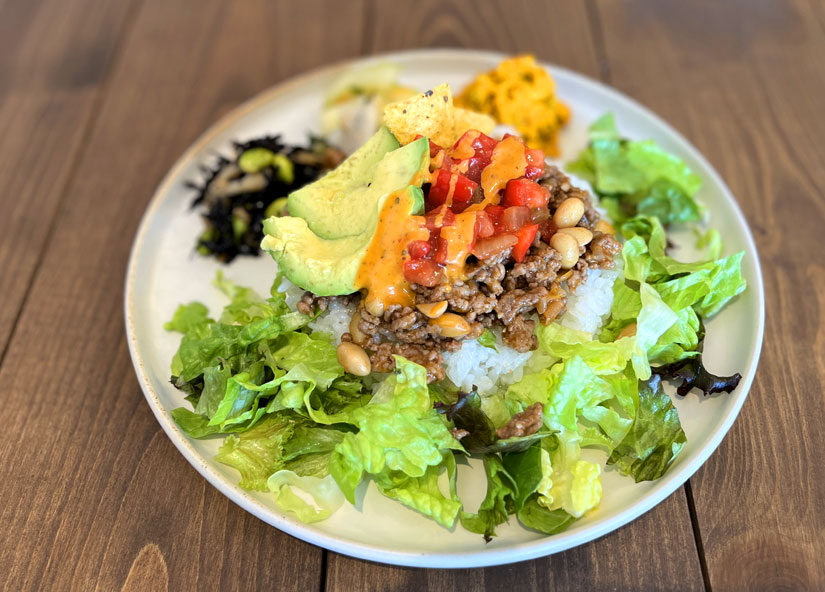 取材時にいただいたのは「タコライス」。牛豚合いびき肉に大豆の水煮を加えて食感にもこだわったタコミートは、サルサソースなどでピリっとした辛味に食が進む美味しさ。※辛味なしも選べます