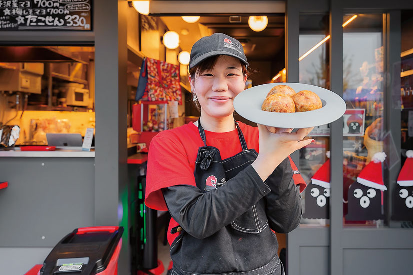 おいしさのヒミツは、うずら、アサリ、コーン、ウインナー、イカ、白玉など、10種類の具材がミックスで入っていること。白玉は熱が入ってもちもち食感に。和風てりやきマヨやダブル明太子など、バリエ-ションも豊富。