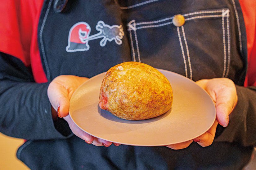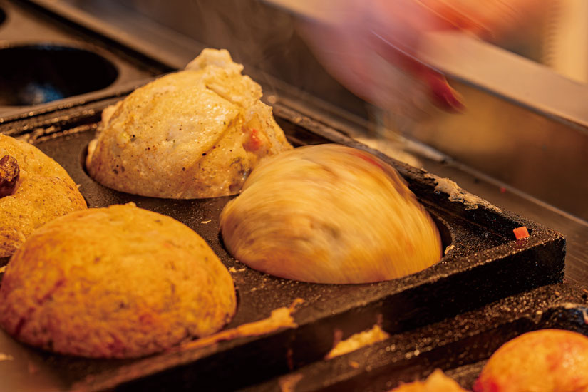 香ばしい香りとともに焼き上がった「ばくだん焼」は、見た目はたこ焼き、中身はとろとろのもんじゃ焼き。10種類の具材からそれぞれの出汁がにじみ出て、お好み焼きのような満足感もある、いいとこ取りの一品です。