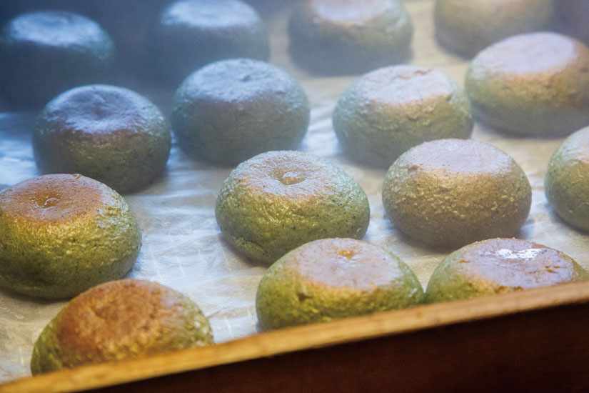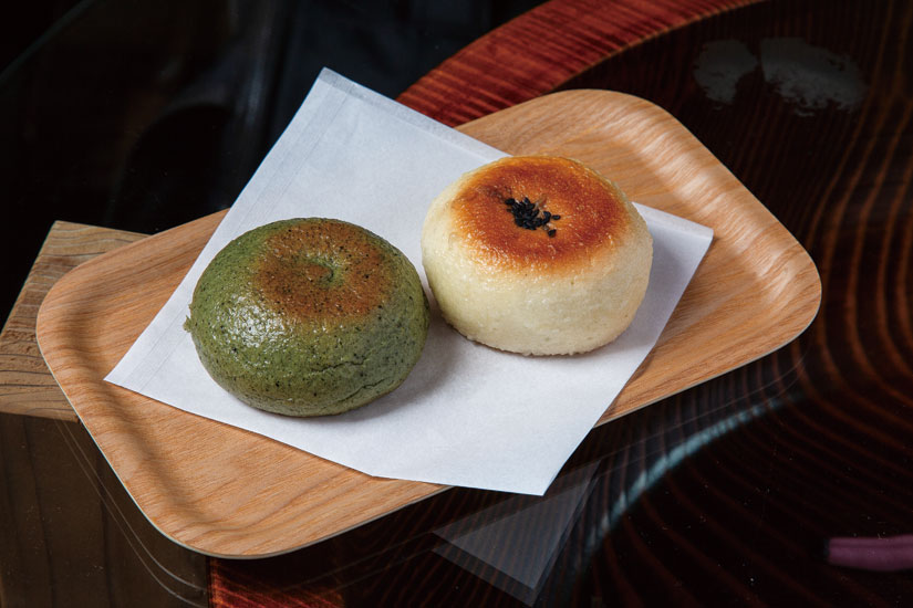 「よもぎ(小倉あん)」(250円/写真左)と、定番具材の「野沢菜」。すべて手作りにこだわり、自家製の生地と具材を一つひとつ手包みで丁寧に仕上げます。