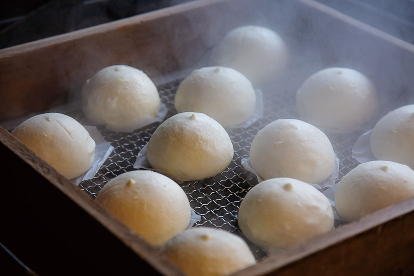 おやきは野沢菜、なす、よもぎ、くるみ(白あん)、切り干し大根の5種類が定番。パンの要素を取り入れたという生地を一度焼いてから蒸すことで、ふっくらとした食感かつ香ばしく仕上がるのが特徴。おやきと同じく人気の肉まんは長野県産の豚肉を使い、シイタケやタケノコなどの具材と相まって旨味たっぷり。どちらもできたて熱々を味わって。