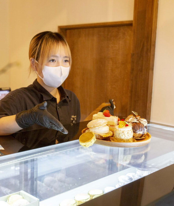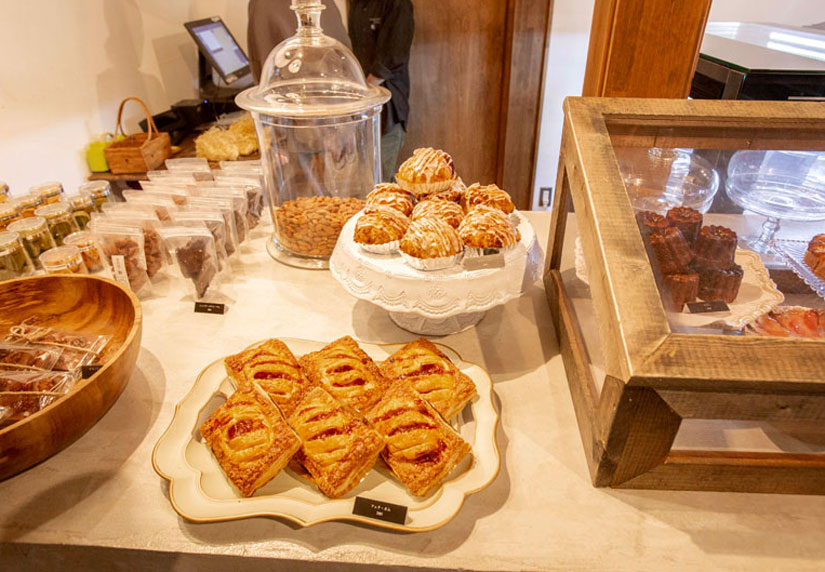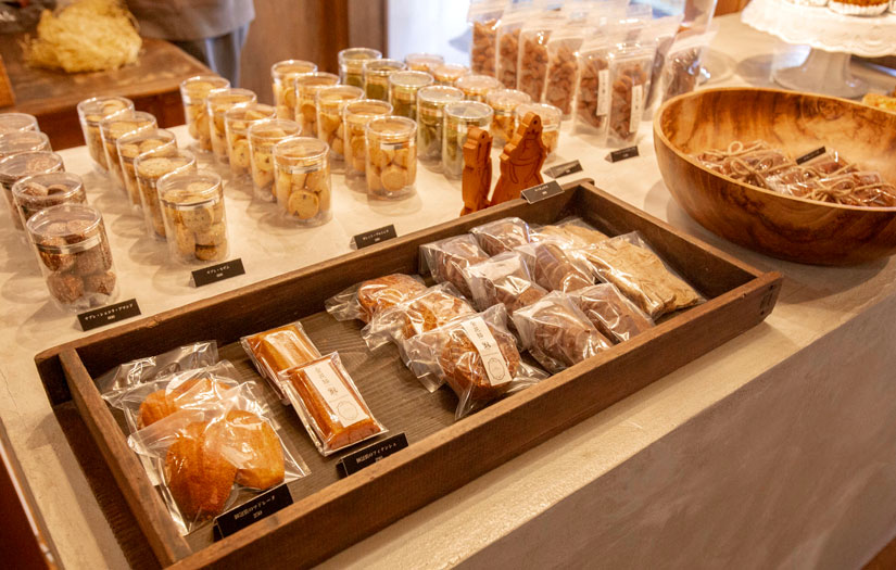 和とアジアンテイストが調和した和モダンな店内には、リンゴやシャインマスカットなど、地元で採れた季節のフルーツを使ったケーキをはじめ、カヌレやマドレーヌ、クッキーなどの焼き菓子が並びます。