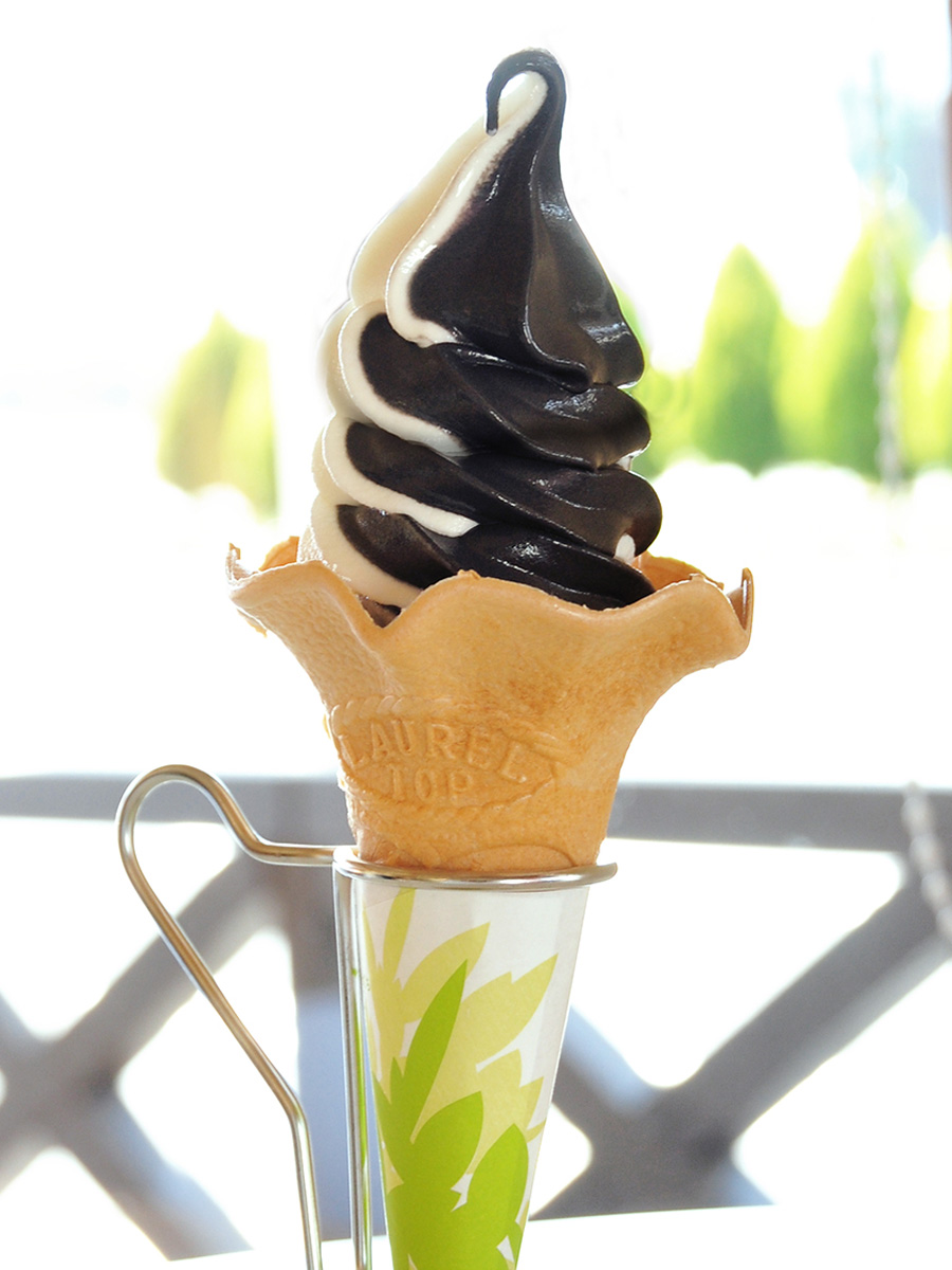 牛柄をイメージした白と黒のソフトクリームは、見た目の可愛らしさだけでなく味わいも格別です。
