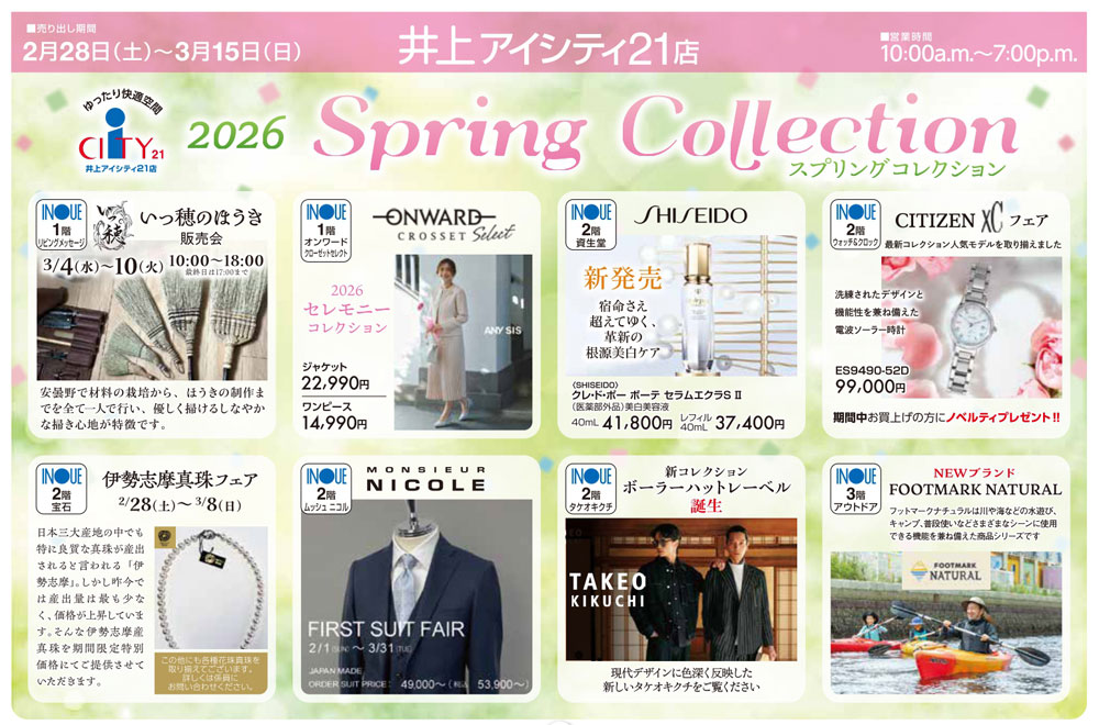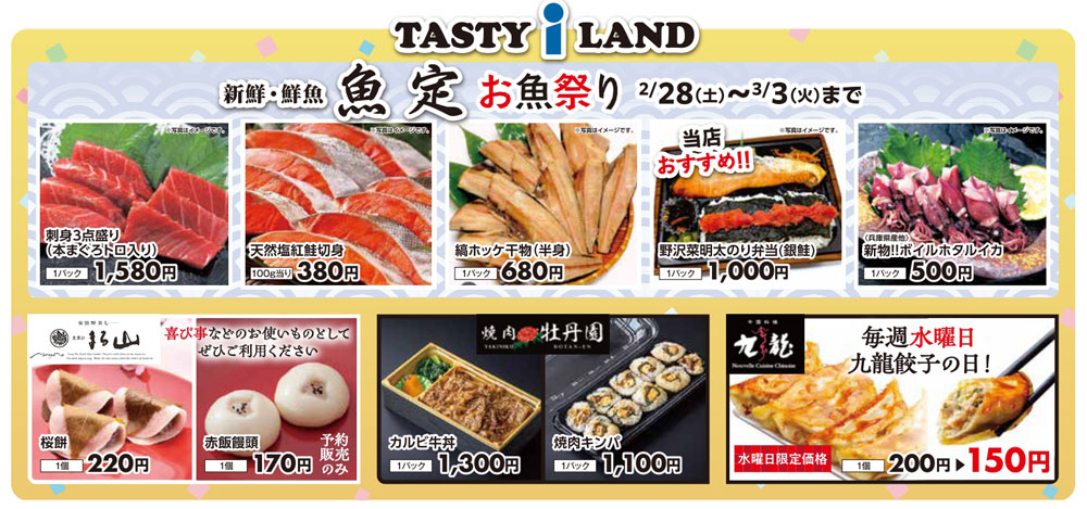 同時期は、「井上アイシティ21」で、『スプリングコレクション』や『新鮮・鮮魚 魚定 お魚祭り』(~3月3日)、毎週水曜『九龍餃子の日』なども行われます。