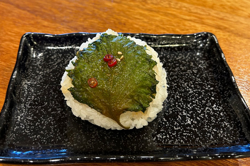 にんにく醤油に漬けた大葉が巻かれた人気ナンバー2の「大葉漬けちりめんむすび」。また、定番の「梅」や「昆布」「鮭」なども用意。