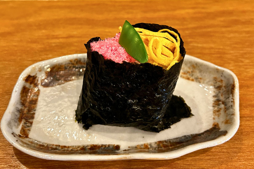 「月替りおむすび」では、季節感を意識したおむすびを提供。3月の月替わりむすびは、桃の節句にちなんだ華やかな「三色ちらしむすび」。中身はしいたけ煮を混ぜ込んだ酢飯で、上には桜でんぶ、サヤエンドウ、錦糸卵を乗せた春らしい一品です。