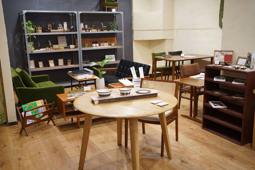 店内には、「いつでも手に入る普遍的なモノ」と、「小規模ながら強いこだわりを持っている職人がつくりだすプロダクト」をセレクト。人気家具「カリモク60」の正規取り扱い店であるほか、日本製にこだわったインテリア雑貨やドリンクなど、店主の榊原さんとサムさんが選んだ商品が揃います。