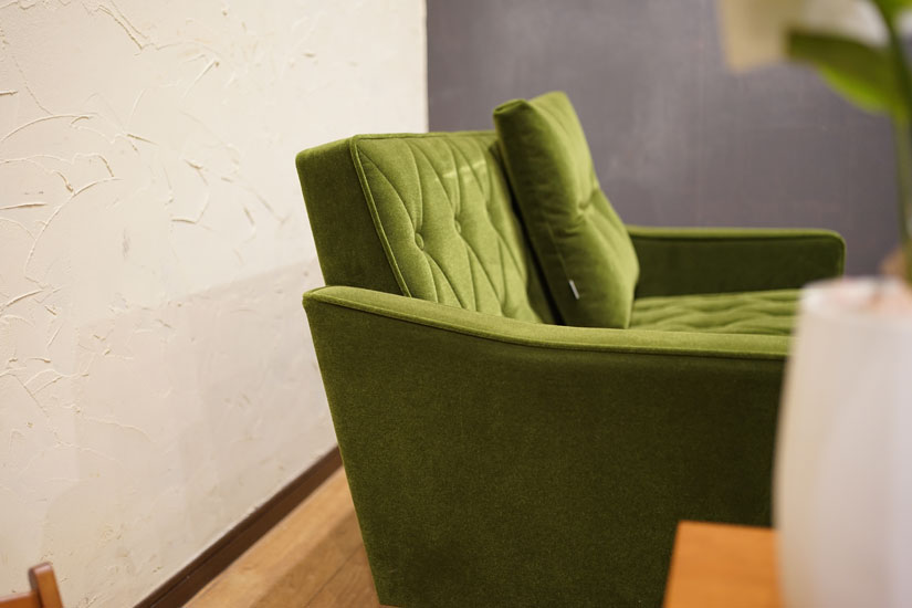 取り揃える家具は、機能的なミッドセンチュリー寄りのデザイン。ソファはバスや列車などに使われる生地を使用。ワンシーターソファは5万円から。画像は名作と評される「カリモク60 ロビーチェア」。