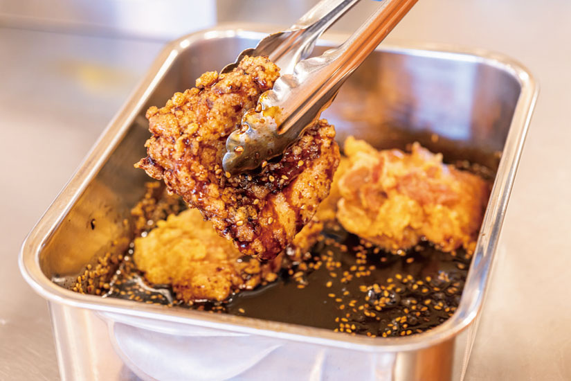 「甘だれ唐揚げ」は、ニンニクを使わずショウガを使用して仕上げた塩唐揚げに、特製甘ダレをたっぷり絡めた店長おすすめのメニュー。子どもも食べやすい、やさしい甘さが特徴。