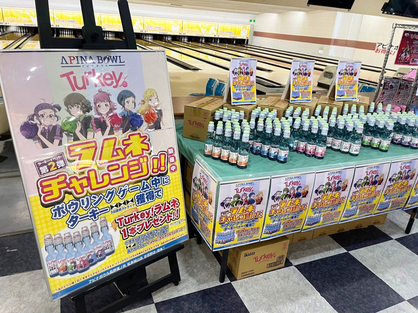 さらに、ボウリングゲーム中にターキー(ストライク3回)達成で「Turkey!」オリジナルラベルのラムネが1本もらえる「ラムネチャレンジ」開催中!
