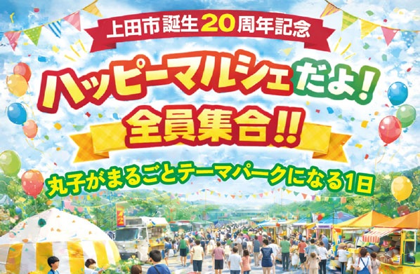 上田市誕生20周年記念事業として、長野県上田市の「丸子中央病院」駐車場、「ザイデンシュトラーセン」「ワミレスサロンまるこ」周辺にて『ハッピーマルシェだよ!全員集合!!』が、2026年3月15日(日)に開催されます。
