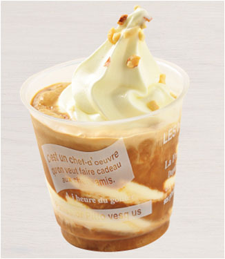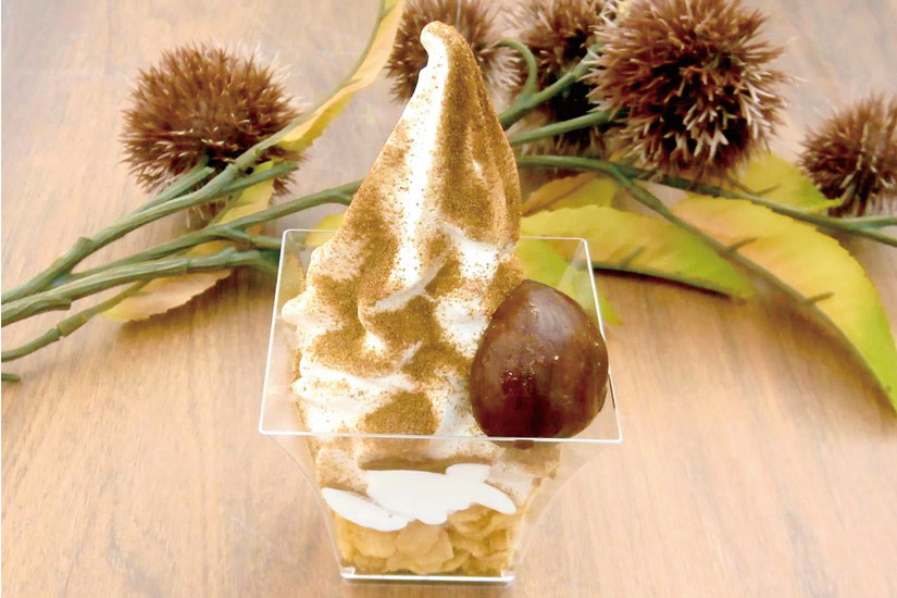 バニラソフトに渋皮栗を丸ごとトッピングした一品です。ほうじ茶とココアのパウダーを重ねた、香り豊かな味わい。食後にもぴったりのデザートです。
