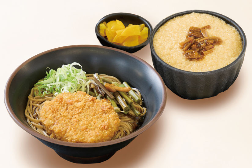 ピリッとしたわさびの風味が広がるコロッケそばです。香りのアクセントが効いた一杯に、信州伝統野菜「ぼたんこしょう」入りなめ茸をのせたとろろご飯付き。しっかり満たされるセット。