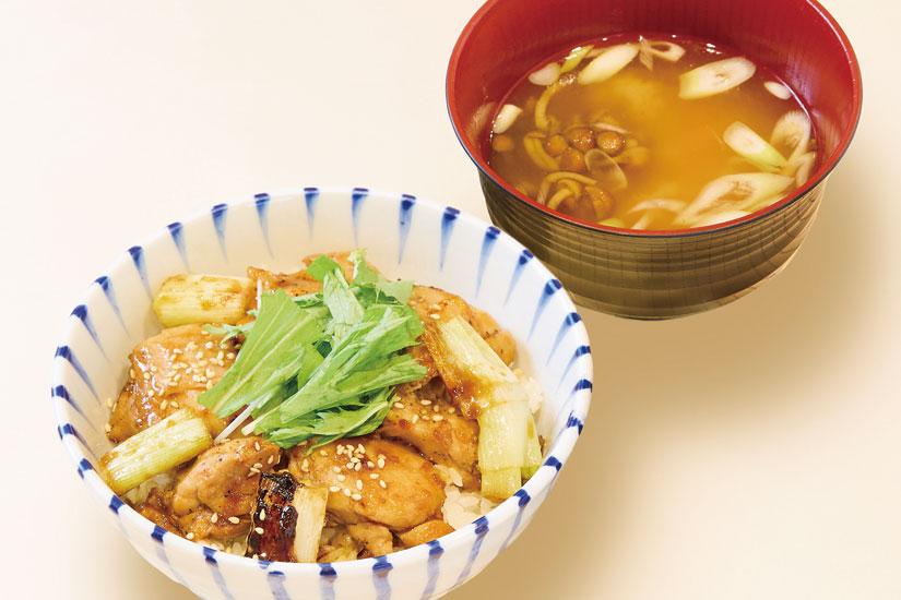 ジューシーな鶏肉とネギを、地元のにんにくダレで絡めた焼き鳥丼です。香ばしさとコクが広がる一杯に、長野県産なめこを使った大椀のなめこ汁付き。満足感たっぷりのセット。