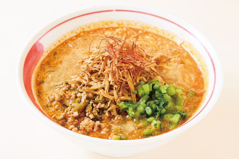 濃厚な味噌スープと自家製麺に、野沢菜入りの肉そぼろと素揚げごぼうをトッピングした担々麺です。くるみの香ばしさがアクセントになった、コク深く香り高い味わい。
