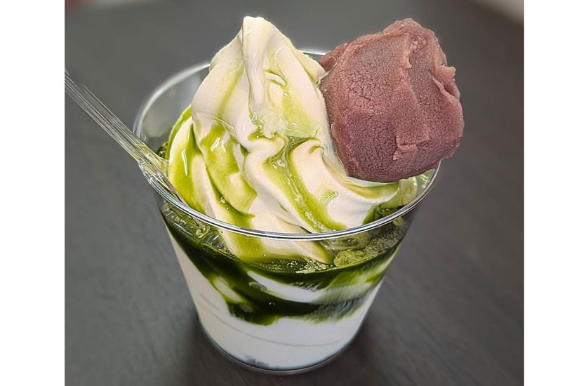長門牧場のソフトクリームに抹茶ソースをかけたサンデーに、碓氷峠名物の力餅をのせた和洋折衷の一品です。もっちりとした餅とひんやりとしたソフトの組み合わせに、抹茶のほろ苦さが重なる味わい。