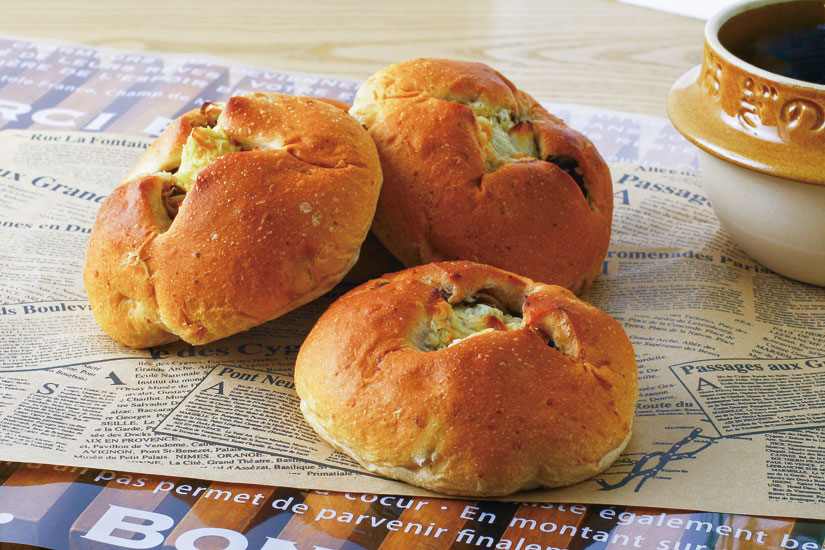 くるみパンの中に鶏肉や椎茸など、「峠の釜めし」の具材を詰め込んだユニークな一品です。具材の旨みが広がる味わい。わさび漬と山ごぼうの2種が楽しめます。