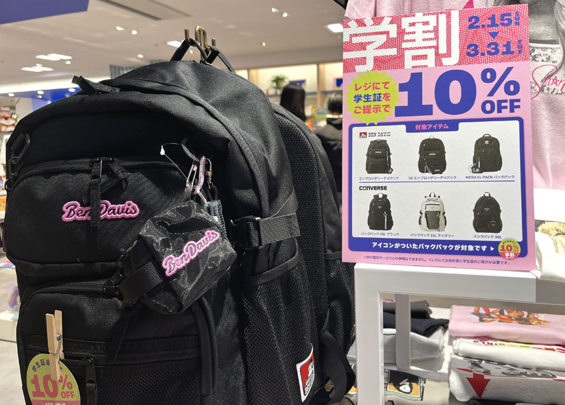 期間中、対象のバックパック商品を購入時、レジで学生証を提示すると10%OFFになるキャンペーンを開催中。※ほかの割引サービスとの併用不可